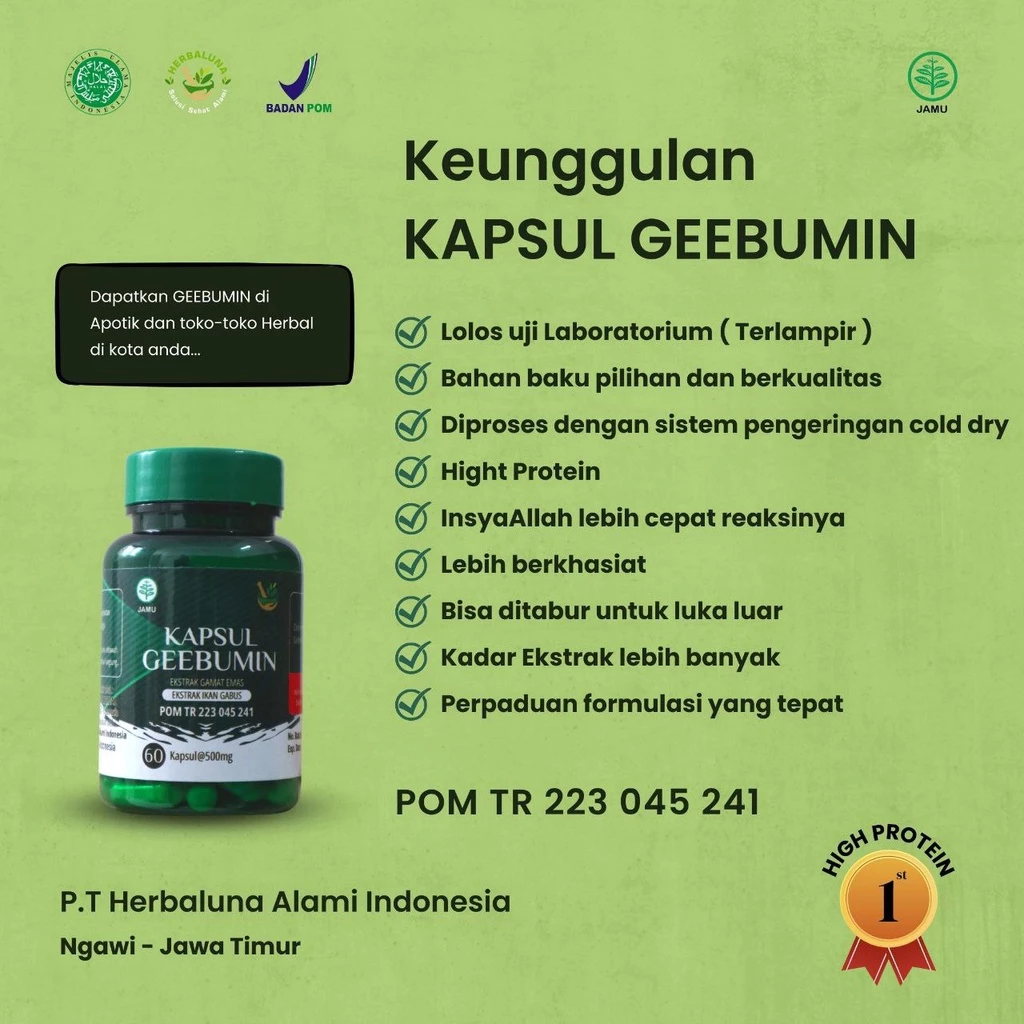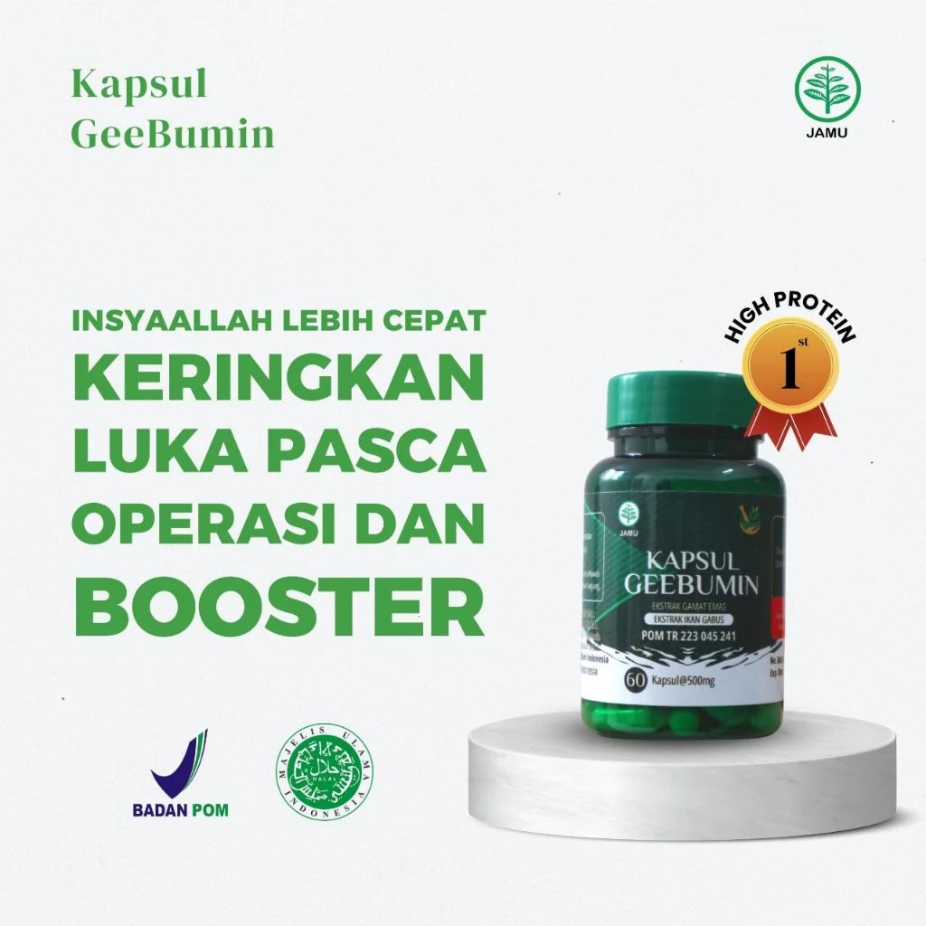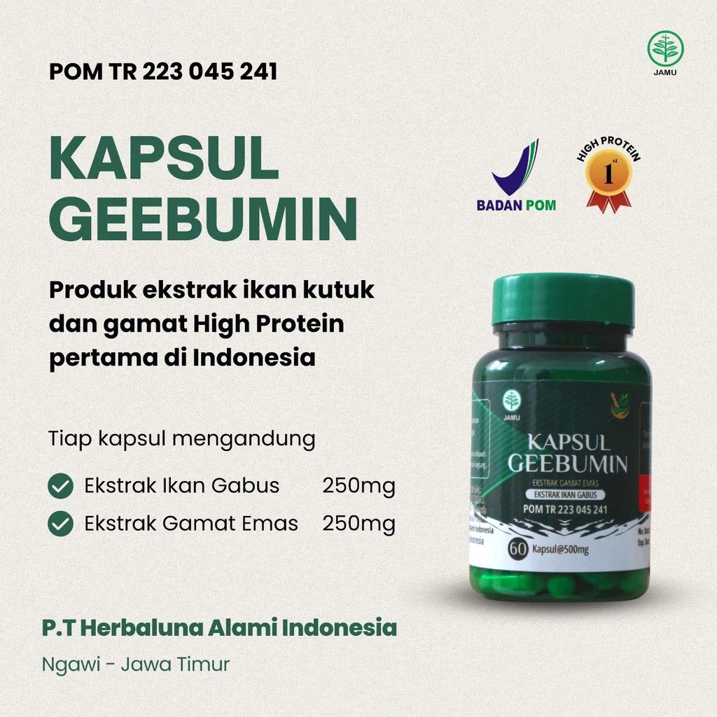 Suplemen Herbal berbasis ekstrak ikan kutuk (ikan gabus) dan gamat emas dengan teknologi cold dry, tanpa pemanasan, sehingga kandungan protein, albumin, EPA, DHA, dan Omega 3 tetap terjaga secara maksimal, Geebumin membantu: